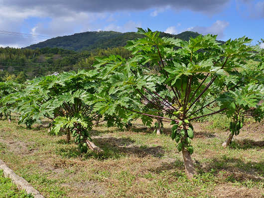 フジバカマ畑、コスモス畑、赤蕎麦畑と廻ったら、最後はパパイヤの植えられているところへも行ってみました。パパイヤ畑はコスモス畑に隣接していて、近くまで行ってみると、幹のようなところからたくさんのパパイヤの実がブドウの房のようにぶら下がっていました。