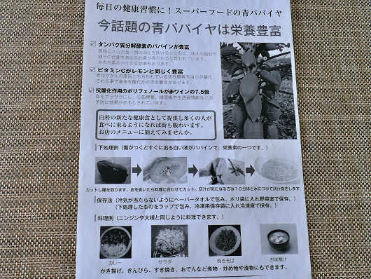 レシピの書かれた紙も付いていたので、下処理の手順通りに半部に割って種を取り除いて皮を剥きました。紙には色んな調理方法が書かれていましたが、今回は初めての青パパイヤなのでシンプルに生のままサラダにして食べました。