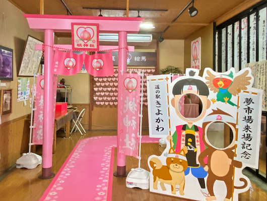 「道の駅 きよかわ」がある旧清川村は、幻の桃ともいわれるとても甘いクリーンピーチが特産品で、物産館の中には鳥居などがピンク色(桃色)をした「桃神社」があります。