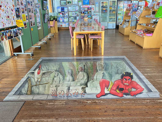 最近は道の駅の物産館内は撮影禁止のところが多いので、ここでは撮影可のトリックアートを撮影しました。トリックアートに描かれている石仏(摩崖仏)はこのすぐ近くにある菅生摩崖仏ですね。