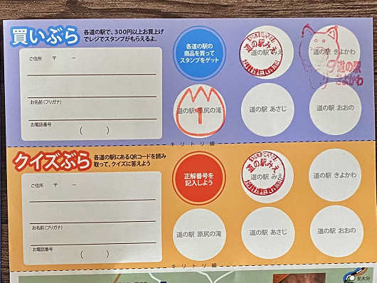 今回のスタンプラリーは「買いぶらコース」と、「クイズぶらコース」に分かれていて、買いぶらコースは300円以上の買い物でスタンプがもらえるので、今回訪れた3つの道の駅では色々と買い物をして、買いぶらコースにスタンプを押しましたが、この道の駅では店員さんが勘違いをして両方のコースにスタンプを押してしまいました(笑)