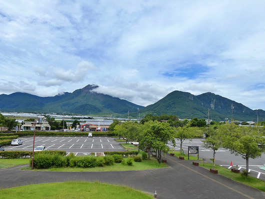 展望台の上から雲仙岳の方角を眺めると、広い駐車場の向こうには左に平成新山と、その右側には眉山が見えました。