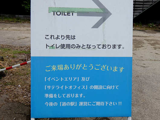 物産館、お食事処の前を通って奥へ進むと、通路は右へ90度曲がって広場を取り囲むようにいくつかの建物がありますが、ここにはこの様な看板が立てられていて、トイレだけが使用可能なようでした。