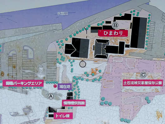 情報提供施設から奥へ進むと道の駅のメイン施設の入口があります。そしてその手前には雲仙普賢岳の噴火による火砕流の後に発生した、土石流によって埋没した集落を保存している「土石流被災家屋保存公園」の入口があります。ここは次の記事で紹介しますね。