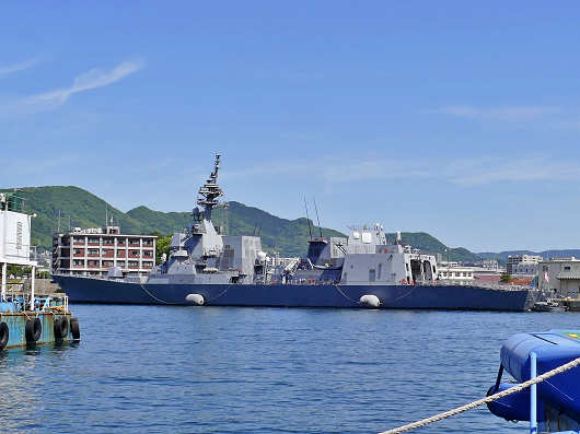 佐世保みなとICで西九州道を降りると、目の前には佐世保港が見えますが、この時は対岸の倉島岸壁には海上自衛隊の護衛艦「すずつき」が停泊していました。佐世保は明治時代から現在まで軍港として栄えているところで、横須賀、呉と並んで三大軍港のひとつなので、いつ訪れてもたくさんの軍艦(護衛艦)が停泊しているんですよね。