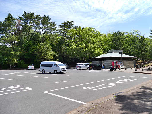 街中の狭い登り口から山道へ入ると、弓張岳の山頂(展望台)までは曲がりくねった狭い道を4km以上も登って行きますが、道路が行き止まりになったところには広い駐車場があります。