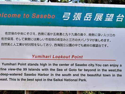 駐車場の横には弓張岳展望台の説明板もありました。展望台からは五島灘と九十九島、佐世保湾、佐世保市街地が望める大パノラマの展望台と書かれていました。