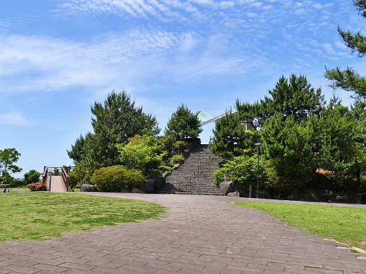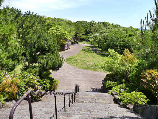 駐車場に車を停めたらさっそく展望台へと向かいました。展望台は画像中央の階段を登った先にあります。