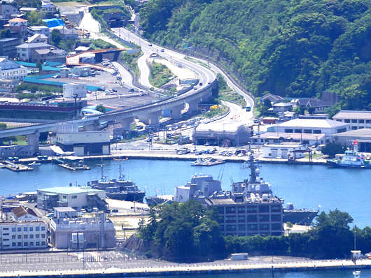 佐世保湾の最奥部です。港の向こう側にはトンネルを抜けた道路が三方に分かれているのが見えますが、ここは西九州道の佐世保みなとICで、先ほどはここで西九州道を降りたんですよね。そして道路を降りた正面には護衛艦「すずつき」がビルに隠れるようにわずかに見えています。