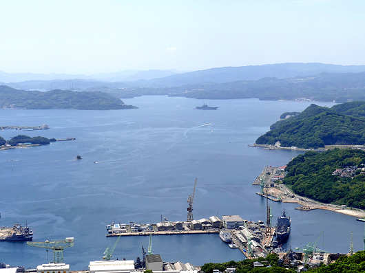 そして佐世保湾の出口側を眺めると、ひときわ大きな艦船が湾の中央付近に停泊していました。