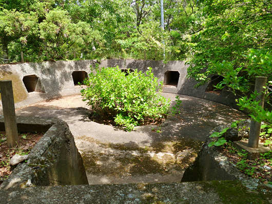 展望台から遊歩道を5分も歩くと砲台跡が見えてきます。説明板によるとここには指揮所を中心に2基の砲台があって、これは一番砲座跡だそうです。コンクリート壁にはいくつもの四角い穴が開いていますが、これらは全て弾薬庫で、砲身がどこを向いていても素早く給弾ができるようにこの様な形に設計されたそうです。