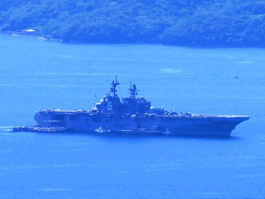 この日は黄砂の影響で空気が霞んでいたので、望遠で撮影した画像をかなり修正して色が少し変になっていますが、この艦船は米海軍の最新鋭の強襲揚陸艦「アメリカ」です。この艦船は排水量が45000t超で、この姿はどう見ても空母そのものですね。前々日まではここに原子力空母「ニミッツ」が停泊していて、今回はそれを見るのも目的のひとつだったんですが、残念なことに前日には出港してしまったんですよね。