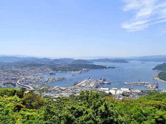展望台から眺めた佐世保湾です。画像の左の方には佐世保市の市街地が広がっていて、右奥の佐世保湾の出口側には先ほど訪れた西海市の島々も薄っすらと見えています。以前りゅう君とここを訪れた時には、雨上がりでモヤが出ていて景色がイマイチでしたが、この日は快晴の天気で、遠くは霞んでいましたが近くの景色はくっきりと見えました。