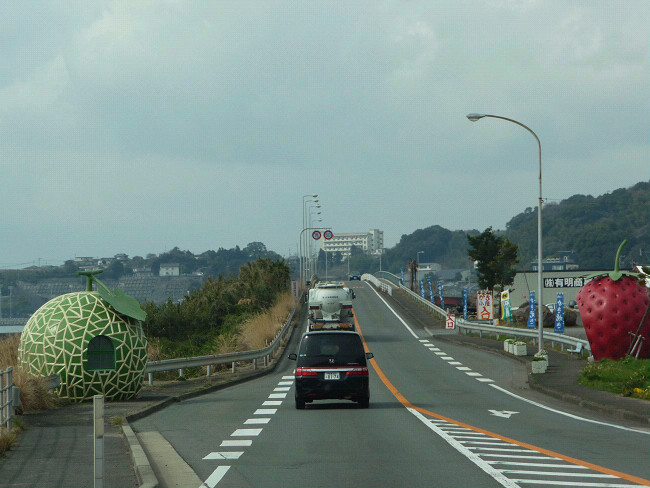 左に見えるのはメロンの形のバス停だよ、右にはイチゴの形のバス停もあるよ。