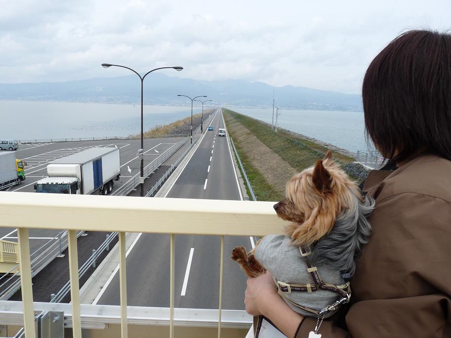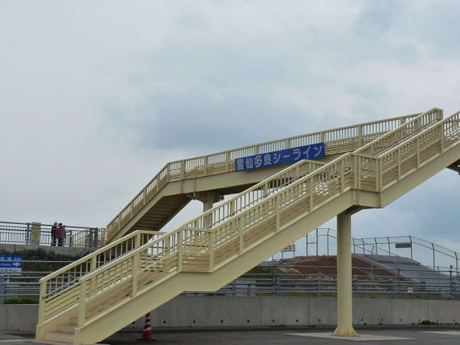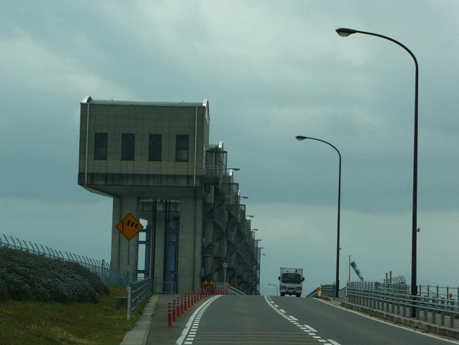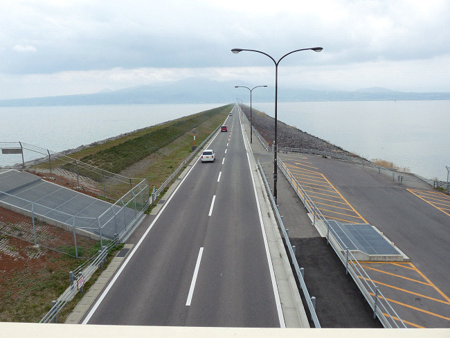 堤防道路のちょうど真ん中あたりに駐車場があって、歩道橋から有明海側と閉切られた陸側が見えるんだよ、10数年前のニュースで話題になった、鉄板を一斉に降ろして諫早湾を仕切った通称ギロチンと呼ばれる映像が衝撃的だったけど、洪水・高潮対策等の為に必要、漁業被害等の為に不必要と賛否が分かれていますが、何にしても、海上をまっすぐに伸びる直線道路は見事なものです。