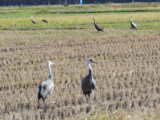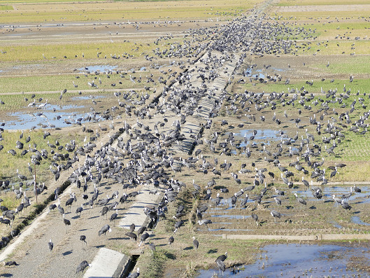 数千羽の群れになって保護地にいるツルも圧巻ですが周囲の田んぼには夫婦2羽だけあるいは親子3羽だけのツルも見れるのでツルの家族の絆の強さを感じます、ツルの夫婦は生涯を伴にするそうですからね、