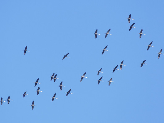 ツル渡来地が近づくに連れて上空では群れになって飛んでいるたくさんのツルが見られるようになってきました、もう夕方が近いのでねぐらになる保護地の水田へと戻っているんでしょうか?