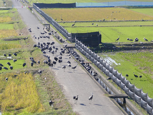 ツルの保護地は周囲をシートによって囲われていて外敵の動物進入や車のライトが当たらないように保護されていますがその外側の農道の上や水田にもたくさんのツルがいます、