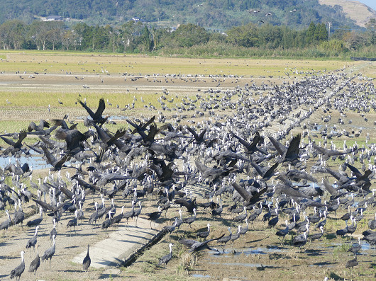 ツルはとても臆病な動物でこの画像はたまたま農作業?の車が近くを通って驚いた鶴の群れが一斉に飛び立ったところです、