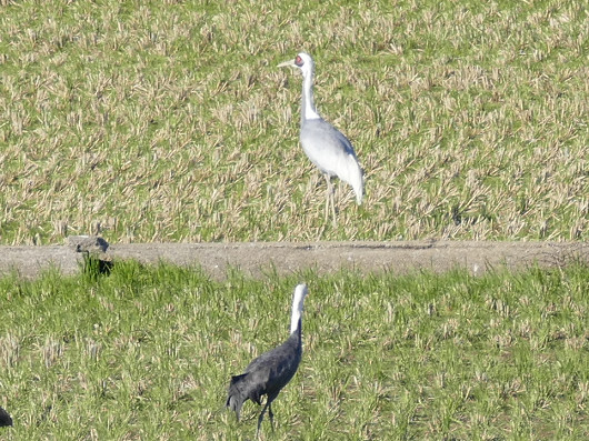 ここにいるツルはほとんどがナベヅルですがよく目を凝らして眺めたらマナヅルがいました、マナヅルは手前にいるナベヅルよりも少し大型なんですね、