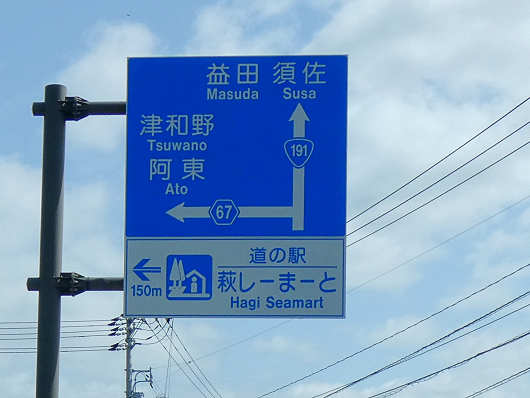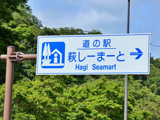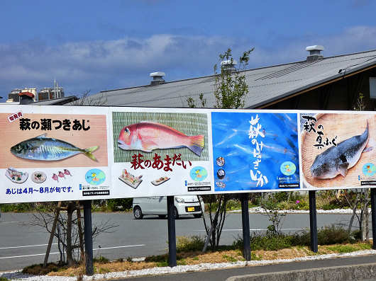 道の駅の入口には萩特産の海産物の看板が立てられていて、この中には萩の真ふぐなどの他に、先ほど訪れた道の駅「萩・さんさん三見」の鯖島食堂のメニュー表におススメ料理と書かれていた「萩の瀬つきあじ」も載っていました。