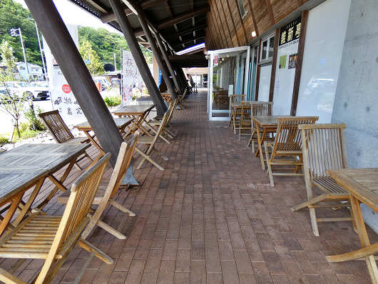 建物の前の通路には他の道の駅と同じように雨除けの庇がありましたが、支柱が斜めに立つ不思議な形をしていて、その下には飲食・休憩用のイス、テーブルがズラリと並べられていました。