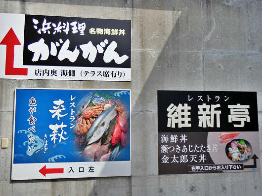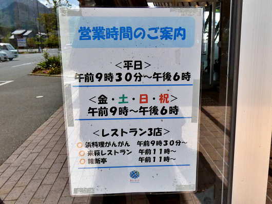 通路には各レストランの営業時間が書かれた看板もあって、9時30分にオープンするレストランもありました。道の駅のレストランでこんな早い時間にオープンするところはほとんど見たことがありませんが、卸売市場のセリの時間に合わせて特に新鮮な魚介を提供しているんでしょうか?