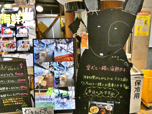 通路にはお食事処の看板も掲示されていました。ここには3軒の海鮮料理のレストランが入っているようでした。道の駅で3軒もの海鮮レストランが入っているところは初めてです。