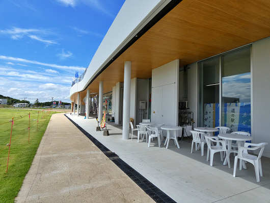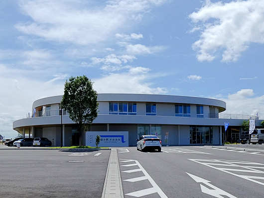 この円形をしたような建物が道の駅の物産館やテナントの入っているメイン施設です。建物は2階建てですが、2階は加工場になっていて、物産館などはすべて1階にあります。この画像だけを見ると広い敷地に建物だけがポツンと建っているように見えますが・・・
