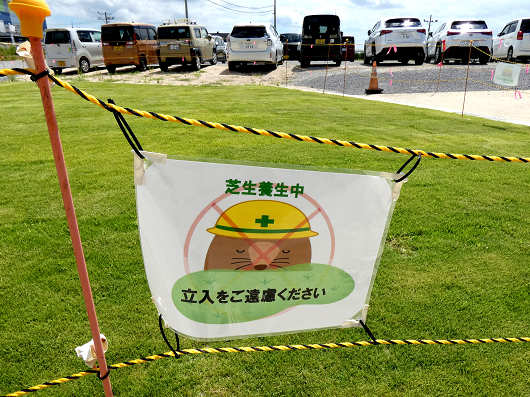 芝生広場は芝生を植えたばかりなのか?立入禁止のロープが張られて、ロープには芝生養生中の表示がぶら下げられていました。