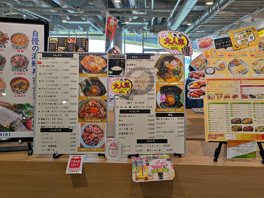 フードコートの入口には各店舗のメニューが掲示されていて、海鮮系や麺類など様々な種類の料理がありました。フードコートには4店舗が入っているようでした。