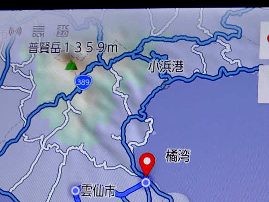 この画像は愛野展望所で撮影したカーナビの画面です。国道57号は小浜港から山へと入って行き、雲仙普賢岳の麓を通って島原市へと続きますが、県道129号(白線部分)を小浜をショートカットして雲仙普賢岳の麓へと続いているので、島原市へは10㎞ほど距離を短縮できるんですよね。
