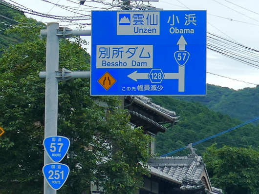 しばらくするとこの様な標識が見えてきました。小浜へは国道57号をさらに6㎞ほど進みますが、今回はここから県道128号(雲仙千々石線)へと左折しました。ここは初めて走る道路で、標識には ゛この先 幅員減少 ゛とも書かれていたので、ちょっと不安はありましたが、この道はどうしても通りたかったので覚悟を決めてここを左折しました(笑)