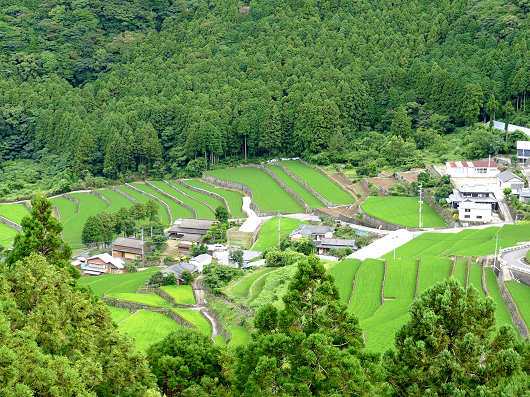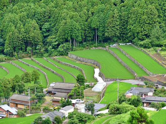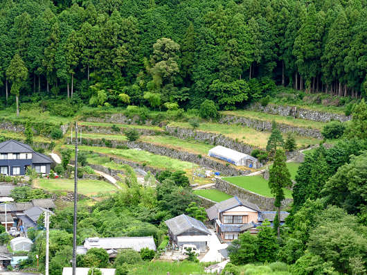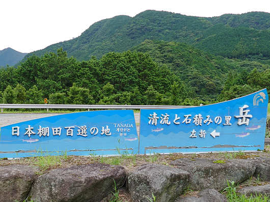 岳地区は周囲を高い山に囲まれた谷間のわずかな土地に集落があるので、その集落を取り囲むように棚田が広がっています。これまでにも棚田はいくつも見ていますが、いずれも山の斜面に田んぼだけが広がっていて、ここのように集落と棚田が一体化したような光景は初めて見ました。