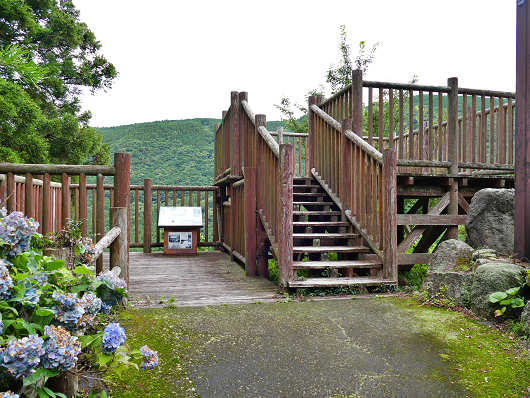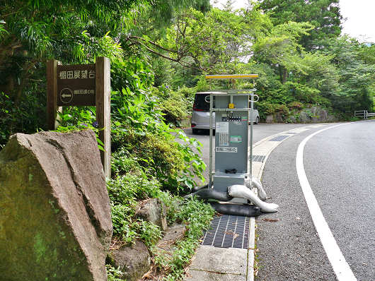 駐車スペースに車を停めたらさっそく展望台へと向かいました。展望台まではわずか数mほどの距離ですが、蜘蛛の巣(糸)がすごくて、一旦戻って道路沿いで木の枝を拾い、それで蜘蛛の糸を払い除けながら展望台へ進みました。