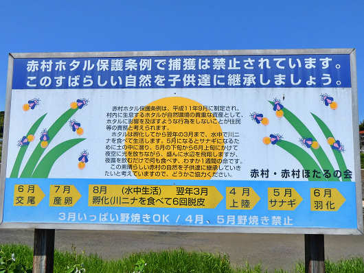 川岸にはこのような看板も立てられていて、ここはホタルの名所にもなっているようでした。この説明板を読むと、赤村ではホタル保護条例を制定していて、ホタルが川の中から地上へ出てサナギになる4月、5月は野焼き禁止と書かれていました。