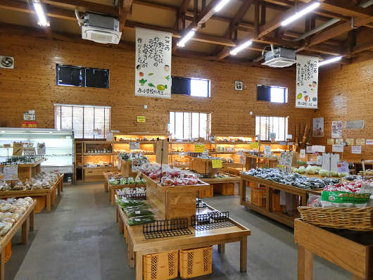 特産物センターの館内はこんな感じで、地元産の農産物がたくさん並べられていました。そしてこの左側は加工施設の建物と繋がっていて、こちらには惣菜、弁当、パンなどが並べられていました。