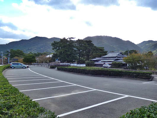 今年の6月にここを訪れた時は松陰神社の境内の駐車場に車を停めましたが、今回は境内へは入らずに、数十mほど離れたところにある無料駐車場に車を停めました。駐車場の向こうに見えている樹木の繁ったところが松陰神社です。