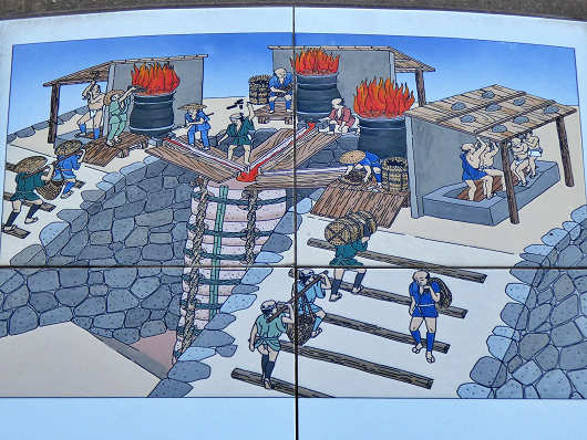 この絵は実際に郡司鋳造所で大砲を造っている様子を表わした想像図ですが、この当時は大量の鉄を一度に溶かす反射炉の技術が無かったので、昔ながらの製法を用いて西洋式の大砲を造ったそうで、造られた大砲は鉄よりも融点が低くて強度の劣る青銅製だったそうです。