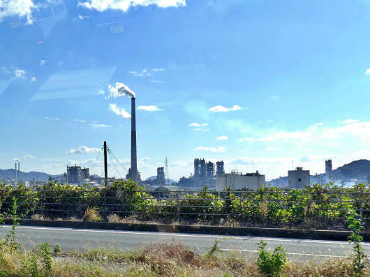 周南市へ入って国道2号を進んでいると、進行方向の右側には大きな煙突が建った工場群が見えてきました。ここは複合化学工場などが集積している周南コンビナートなんでしょうか?そして画像には写っていませんが、工場群の向こうには瀬戸内海も見えました。