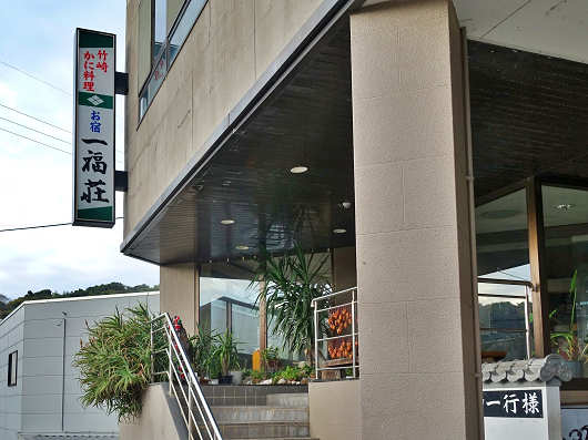 ここがこの日宿泊する竹崎かに料理のお宿「一福荘(いっぷくそう)」です。このお宿の目の前には竹崎漁港があって、お宿の前を通る道は県道295号ですが、ここが県道295号の起点(終点)になります。