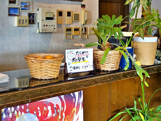 チェックインの手続きをしている時に何気なくカウンターの上を見たらかごに入ったみかんが置かれていて「たらみかん 極早生 ご自由にどうぞ」と書かれていました。ウェルカムドリンクじゃないですけど、ウェルカム太良みかんですね(笑)アットホームな雰囲気がするとても暖かみがあるお宿ですね。