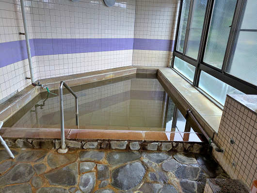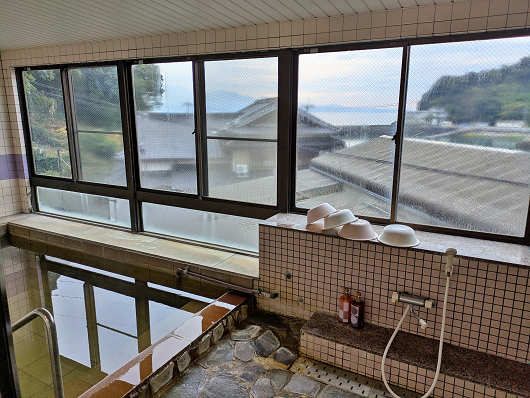 男性用大浴場です。浴槽はあまり大きくありませんが、部屋数(宿泊者数)からすると充分な広さですね。そして窓からは竹崎漁港も見えましたが、何といっても便利だったのが部屋から歩いて十数歩のところにあるんですよね(笑)