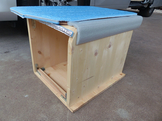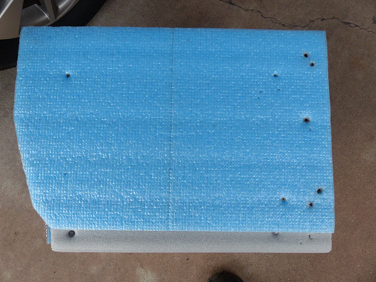 そこで車のシートとほぼ同じ高さで助手席の足元の空間を無くすために、この様な形のボックスをホームセンターで買った合板で作りました、天板にはクッションを兼ねて車の内装との擦れによるキズ防止のためにキャンプ用の断熱マットをボックスよりほんのわずかだけ広めに貼り付けました、
