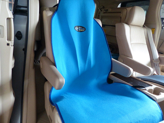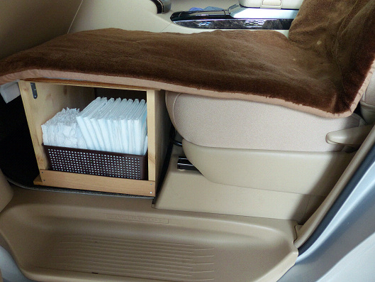 おっと、ひとつ忘れてました、ボックスをセッティングする前にシートの汚れを防止するために、シートエプロンって言うトヨタ純正のシートカバーを取り付けます、これは10年以上も前に購入したものですが、ウェットスーツと同じ素材で完全防水になっているので、りゅう君が吐いてもお漏らしをしても(笑)、シートの汚れを防げます、