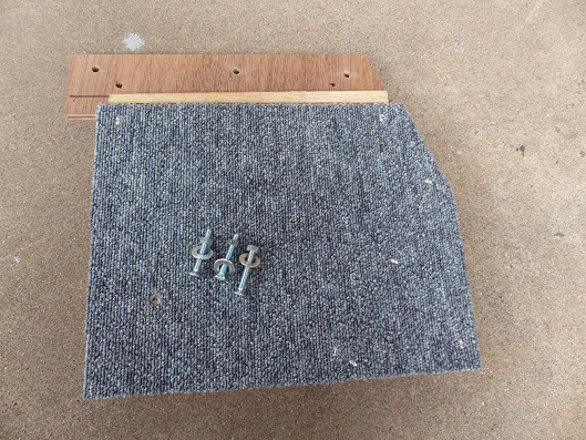 次にこのボックスをセカンドシートへの取り付けです、セカンドシートへのセッティングの前に一枚の合板をボルト3本でボックスに取り付けます、この合板の一部にはこれもホームセンターで購入したタイルカーペットをカットして貼り付けています、