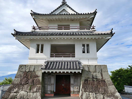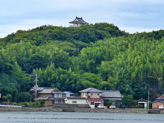 過去に泊まったお宿の前から南の方角を眺めると、山の上にお城の天守閣のような建物が見えます。ここは「竹崎城址展望台」といってここが次の目的地です。