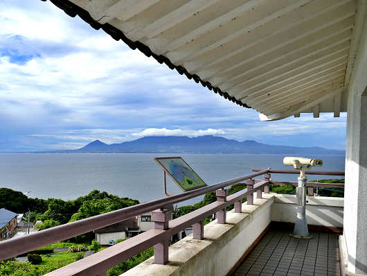 展望台の3階はこの様な感じで双眼鏡も設置されていて、通路は建物の周りをぐるりと廻っていて360度の展望が望めました。この画像は南側を眺めた光景で、遠くには島原半島が見えています。