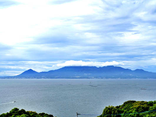 これがこれから向かう予定の島原半島です。左端のきれいな形をした山が眉山で、その右側が雲仙岳でしょうか?今回は雲仙普賢岳の溶岩ドームの平成新山を間近に望む「仁田峠第二展望所」へも行く予定ですが、雲仙岳の山頂付近は雲がかかっていてちょっと気になりますね。