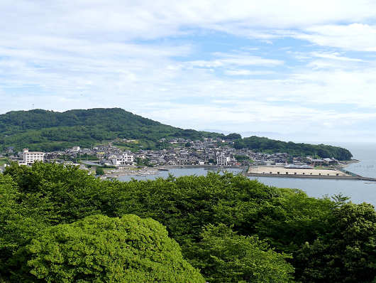 反対の北側を眺めると、先ほど訪れたばかりの道越漁港と集落が見えました。そしてよく眺めると左端のほうには「夜灯見荘」と「平浜荘」も見えました。
